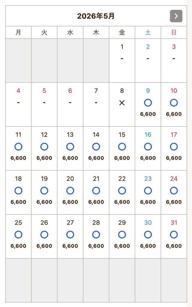 カレンダーの「−」はスクールを実施していない期間。「×」はお休みまたは予約が埋まっている状態となります。